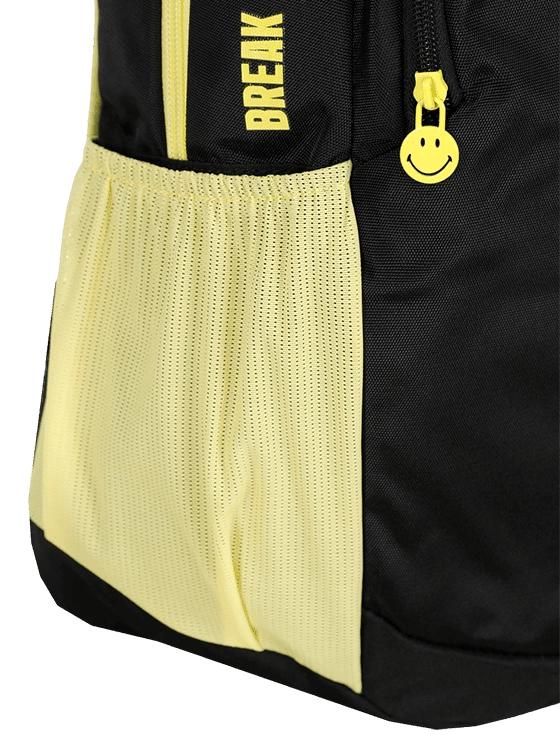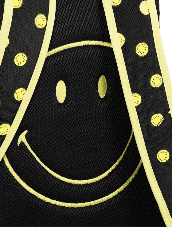 Чёрный фон дополнен жёлтыми молниями и принтами смайликов, а на спинке вышит фирменный смайл — символ энергии и позитивного настроя.